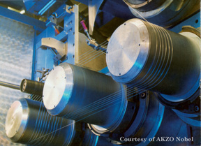 Gel spinning is a special process used to obtain high strength or other special fiber properties. The polymer is not in a true liquid state during extrusion. Not completely separated, as they would be in a true solution, the polymer chains are bound together at various points in liquid crystal form. This produces strong inter-chain forces in the resulting filaments that can significantly increase the tensile strength of the fibers. In addition, the liquid crystals are aligned along the fiber axis by the shear forces during extrusion. The filaments emerge with an unusually high degree of orientation relative to each other, further enhancing strength. The process can also be described as dry-wet spinning, since the filaments first pass through air and then are cooled further in a liquid bath. Some high-strength polyethylene and aramid fibers are produced by gel spinning.