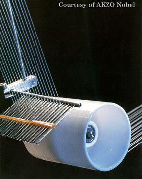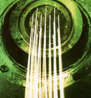 Most synthetic and cellulosic manufactured fibers are created by “extrusion” — forcing a thick, viscous liquid (about the consistency of cold honey) through the tiny holes of a device called a spinneret to form continuous filaments of semi-solid polymer.